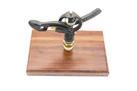 Solid brass components with stainless steel blade fitted on wooden base